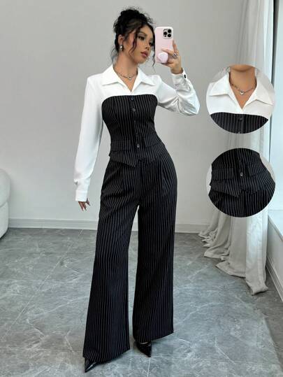 طقم حريمي قطعتين Gloray طقم قطعتين كاجوال للسيدات بياقة وتصميم بلون مخطط، مناسب للربيع والخريف