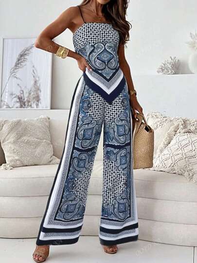 طقم حريمي قطعتين مجموعة قطعتين بنمط بوهيمي أنيق للربيع والصيف، تتكون من قميص قاعدي ذو رباط غير متماثل وبدلة سروال واسع الساق