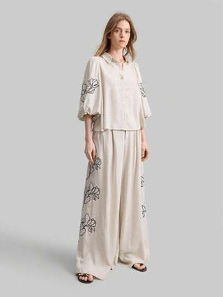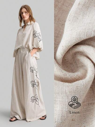 طقم حريمي قطعتين Ontre مجموعة بلوزة نوم وسراويل عريضة ألوان كتان, تطريز أزهار، نمط بوهيمي، سهل وراحة للاصطياف