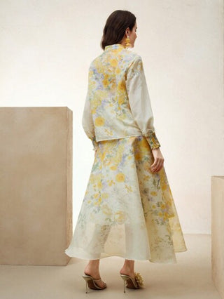 طقم حريمي قطعتين Anewsta طقم قميص أنيق - قميص بأكمام طويلة مزخرف بنقشة طباعة أسلوب قصر وتنورة واسعة متوسطة الطول