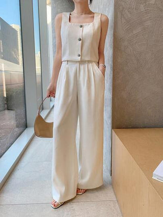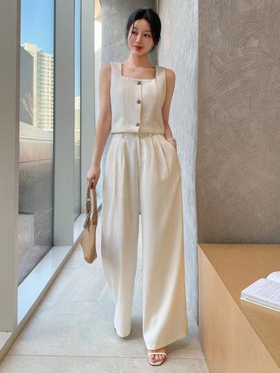 طقم حريمي قطعتين DAZY مجموعة من 2 قطعة للنساء: ملابس علوية بياقة مربعة وبنطال ساق عريضة، لون واحد
