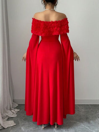 فساتين حريمي Rafferiza فستان كاجوال طويل الأكمام مزين بزهور ثلاثية الأبعاد للنساء ، لون أحمر أنيق ذو كتف مكشوف مناسب لمناسبات عيد الحب والمواعيد الرومانسية