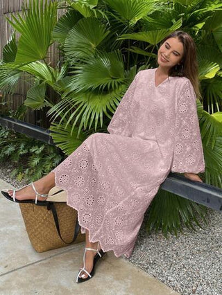 فساتين حريمي DAZY فستان طويل الأكمام بطراز بوهيمي لارتداء فوق الفساتين ،كحري اللون، بياقة على شكل حرف V، من قماش جاكارد فضفاض للنساء، فستان صيفي