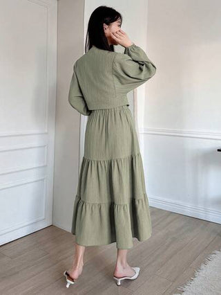 طقم حريمي قطعتين DAZY طقم قميص ذو رقبة على شكل حرف V وتنورة ذات أكمام منتفخة، موديل ربيعي، 2 قطعة