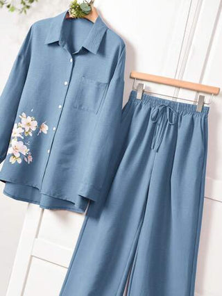 طقم حريمي قطعتين Rusticease مجموعة قميص كم طويل وبنطال ساق واسع مطبوع بطبعة زهور للنساء 2 قطعة/مجموعة