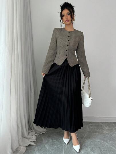 طقم حريمي قطعتين Elenzga بدلة أنيقة مكونة من جاكيت نسائي قصير الأكمام من التويد والتنورة المتوسطة الطول المطوية
