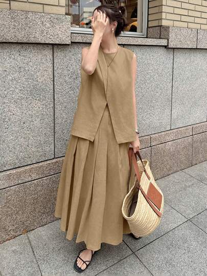 طقم حريمي قطعتين FRIFUL مجموعة عطلة للنساء: 2 قطعة ملابس علوية أساسي بدون أكمام ذو خصر مرتفع وتنورة, نمط رجعي من الكتان
