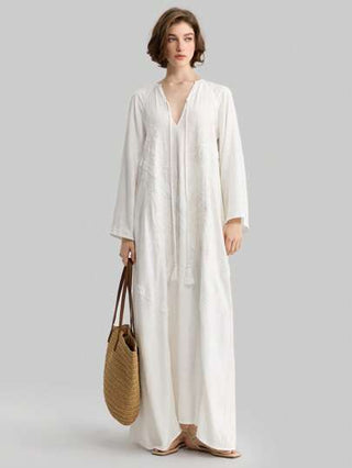 فساتين حريمي Ontre فستان صيفي للنساء بياقة على شكل حرف V وأكمام رغلان طويلة، أناقة وراحة بأسلوب بوهيمي، لون أبيض، تصميم بسيط وعصري