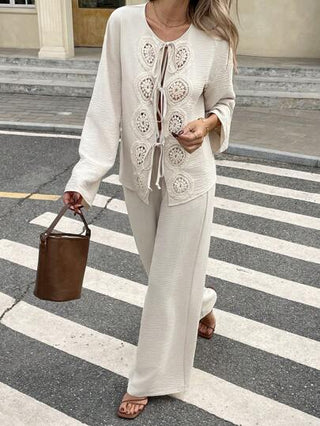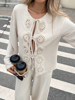 طقم حريمي قطعتين Serisse مجموعة قميص و بنطلون من قطعتين نسائية ، قميص بأكمام طويلة مزين بالدانتيل والربطة أمامية ، بنطلون موحد اللون ، مجموعة قطعتين كاجوال للحياة اليومية والخروج ، مجموعات صيفية ، مجموعة خريف وربيع ، مجموعة عطلة ، مجموعة قماش كتان