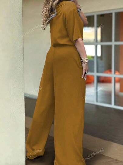 مجموعة بقطعتين للنساء، تي شيرت قصيرة الأكمام بياقة دائرية وبنطلون طويل ذو خصر مطاطي بجيب وسحاب، لون عادي، طقم كاجوال للصيف