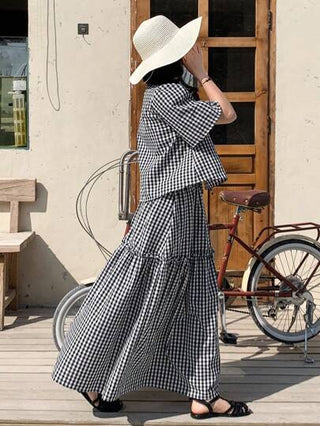 طقم حريمي قطعتين FRIFUL مجموعة قطعتين للنساء باللونين الأبيض والأسود في نمط الجنزال، تتكون من قميص بطراز بلدي وتنورة ملفوفة مزودة بربطة ع شكل فيونكة