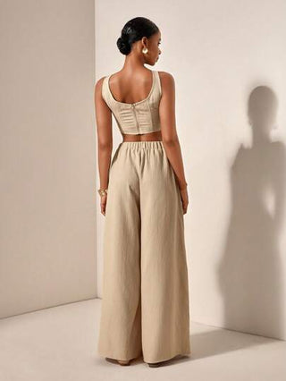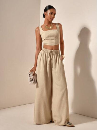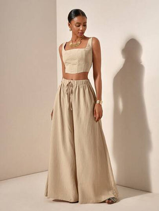 طقم حريمي قطعتين Zivah طقم مكون من قطعتين من ملابس علوية بحزام على شكل عظمة السمكة وبنطلون واسع الساق مع جيوب لعطلة الربيع والصيف الجديدة، مصنوع من قماش منسوج - B