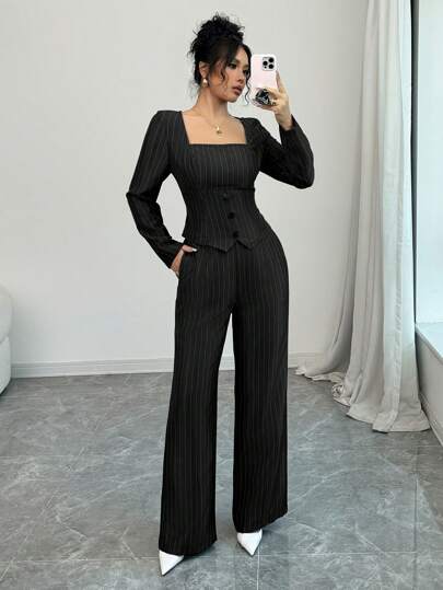 طقم حريمي قطعتين Elenzga طقم أنيق من البليزر ذو الياقة المزيفة والأكمام الطويلة والمخطط + بنطلون مخطط للذهاب إلى العمل للمرأة
