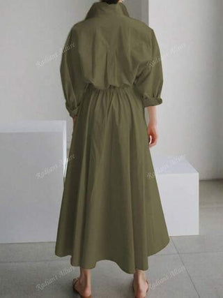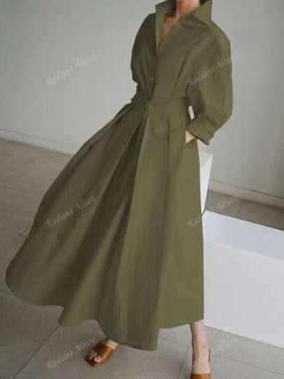 فساتين حريمي نمط جديد للربيع والصيف لون أملس، موضة قميص صيفي V الرقبة منسدل الطول مزود بأزرار