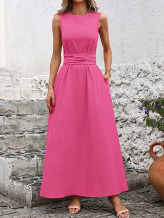 فساتين حريمي Clasi فستان كاجوال للنساء بجيب وعقدة الخصر بدون أكمام ورقبة مستديرة باللون الواحد