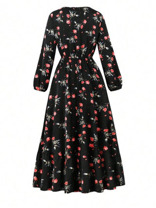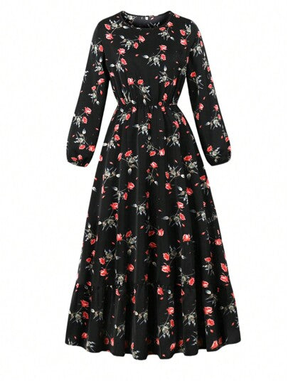 فساتين حريمي فستان طويل كاجوال فضفاض مطبوع بالزهور، ياقة دائرية وأكمام طويلة وخصر مربوط بسحّاب، للاستخدام في المناسبات والعطلات في فصلي الربيع والخريف