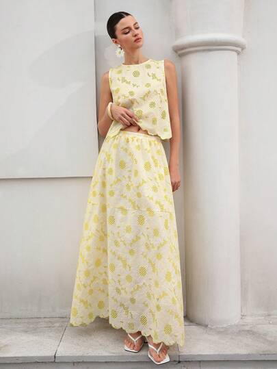 طقم حريمي قطعتين Aveloria Rosie مجموعة نسائية من 2 قطعة، ملابس علوية علوي قصير بأكمام بلا أكمام مرتخي، رقبة دائرية، تطريز زهري مع تفاصيل مفرغة أنيقة؛ وتنورة شبه دائرية، متدفقة مع خصر مطاطي قابل للتعديل وكسرات عند الهيم، بأسلوب عطلة فاخر
