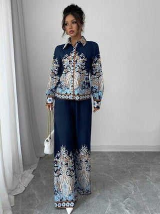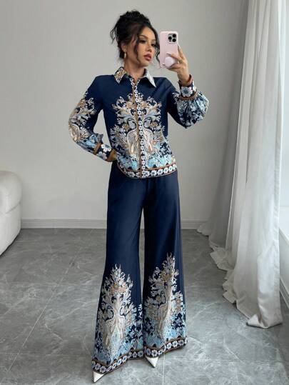 طقم حريمي قطعتين Calvaya طقم بقميص كاجوال مطبوع بطراز قصري طويل الأكمام بإضافة بنطال واسع الساق بخصر مطاطي مكون من قطعتين للنساء