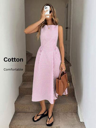 فساتين حريمي Luneh فستان أنيق يصل إلى المنتصف، أساسي، بدون أكمام، مزين بكسرات عند الخصر وخط A، من قطن ذو خطوط نافرة باللونين الأزرق والأبيض لأوقات الاستجمام والعطلات للنساء