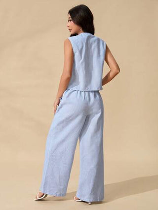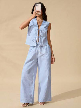 طقم حريمي قطعتين PETITE مجموعة قميص كاجوال بدون أكمام مع فيونكة أمامية وبنطال رجل واسع ذات خطوط زرقاء وبيضاء مكونة من قطعتين للنساء