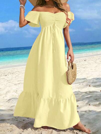 فساتين حريمي Breezaya فستان عطلة أرض بمقاس كبير بلون أحادي مع كشكش على الأكتاف مناسب للعطلات والشاطئ