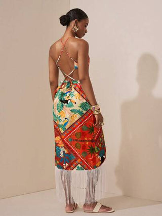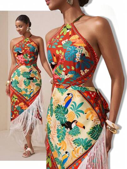 فساتين حريمي Slaydiva فستان طباعة زهور بتصميم مجوف عند الخصر مع تصميم شراشيب في الذيل، لموسم الربيع والصيف 2025. مناسب للرحلات والاستخدام اليومي والسفر والشاطئ