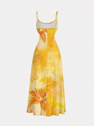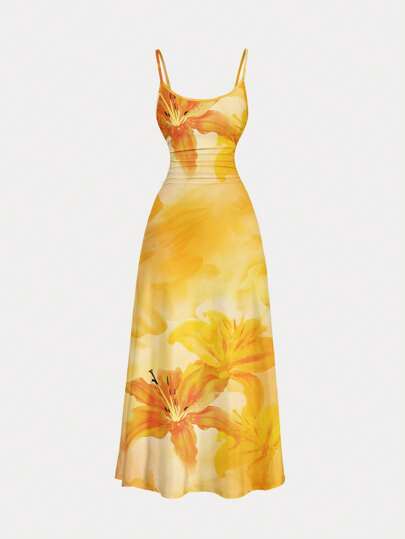 فساتين حريمي MOD فستان كاجوال أنيق مطبوع بزهور صفراء مع كسرات في الخصر وحافة مكرمشة مُناسب لفصل الصيف