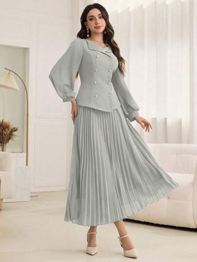 طقم حريمي قطعتين Modelyn العيد مجموعة قطعتين للنساء تتكون من توب بأكمام فوانيس أنيقة وبسيطة و تنورة مطوية