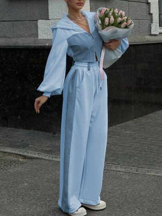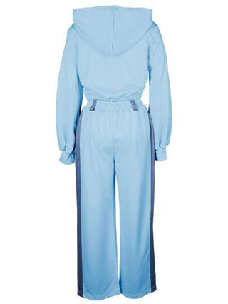 طقم حريمي قطعتين طقم حريمي من قطعتين ( تاب بأكمام طويلة وغطاء للرأس وبنطال بخصر قابل للشد) ، متباينة الألوان