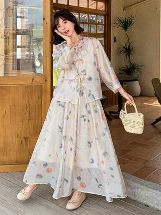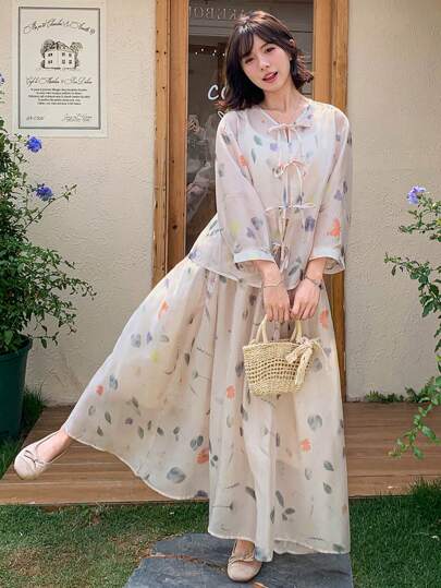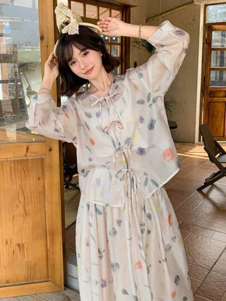 طقم حريمي قطعتين FRIFUL طقم بلوزة وتنورة للنساء مطبوعة بنقشة الأزهار الملونة بالكامل، طقم كاجوال للإجازة الصيفية قطعتان