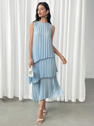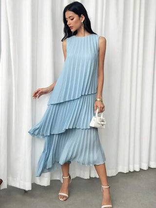 فساتين حريمي Modelyn العيد فستان نسائي أحادي اللون بياقة مستديرة بلا أكمام بتصميم طبقات وذيل مكسّر