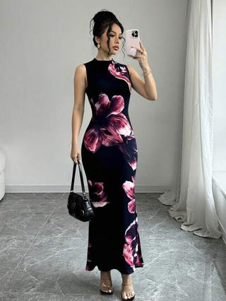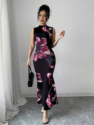فساتين حريمي Elenzga فستان ضيق بطبعات زهرية، رقبة عالية، ذيل سمكة