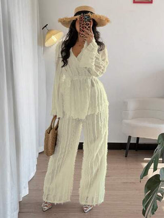 طقم حريمي قطعتين Islaluna طقم قطعتين أنيق وعصري رومانسي من الريش، يتكون من ملابس علوية كم طويل رفيعة وبنطال