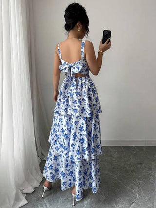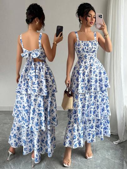 فساتين حريمي Elenzga فستان نسائي أنيق بلا أكمام مطبوع بزهور، صيفي/ربيعي أنيق، له طبقات وحزام على الخصر، منعش، مناسب للإرتداء في موعد شاطئي، فستان ماكسي