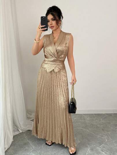 طقم حريمي قطعتين Gloray بلوزة بياقة مزركشة باللون الذهبي بدون أكمام وتنورة وسطية مطوية قطعتان معا، مجموعة أنيقة للسيدات
