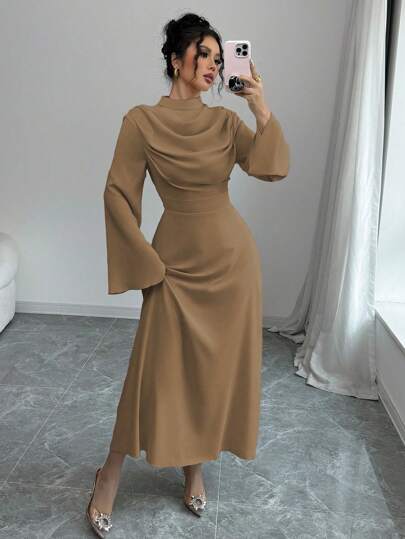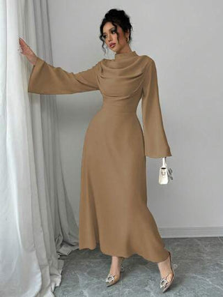 فساتين حريمي Elenzga فستان نسائي بياقة واقفة وأكمام طويلة قصير الأكمام وطويل بقصة موحد اللون، إطلالة نسائية طويلة