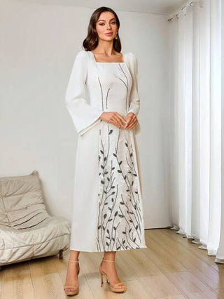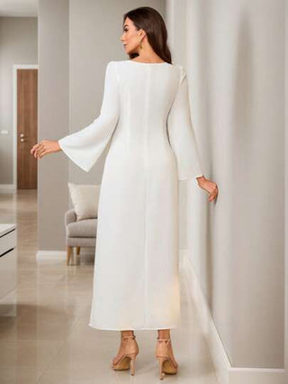 فساتين حريمي Modelyn العيد فستان طويل الأكمام بياقة مربعة ومن الشبك المرصّع بالترتر والخرز الأنيق باللون الأبيض