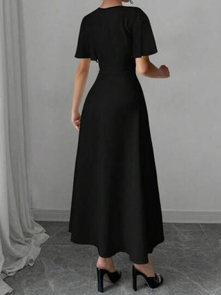 فساتين حريمي Rafferiza فستان صلب قصير الأكمام بياقة مستديرة وخصر مشدود مع زينة وردة ألوان مائلة، فستان طويل للنساء لفصلي الربيع والخريف