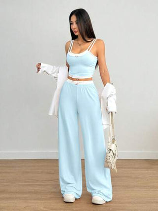 Flirla مجموعة رياضية أمريكية عادية مكونة من قطعتين، توب بدون أكمام رمادي وبنطال طويل ديكور بأزهار منقوش على الخصر المتوسط، ملابس نسائية صيفية