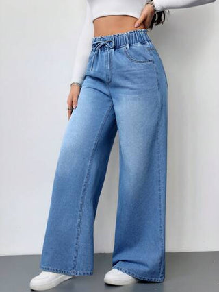 Tall بنطال جينز للنساء، قطع عالي الخصر واسع الساق، لون أزرق، ملابس صيفية للنساء، بخصر مرن، بنطال جينز فضفاض وواسع، قطع رسمي مستقيم