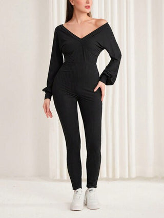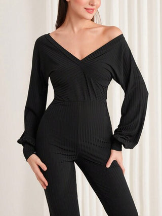 VaVaBold جمبسوت يونيتارد موحدة اللون بياقة V أكمام فانوس محبوك مضلع