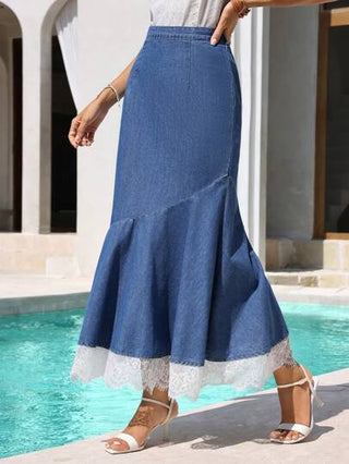 VCAY تنورة جينز نسائية بلون أزرق وحاشية من الدانتيل المكشكش، تصميم الجزء العلوي من القطع، مثالي للعطلات الشاطئية والأنشطة الترفيهية