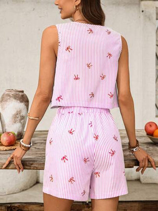 VCAY مجموعة من 2 قطعة ، ملابس علوية كاجوال للنساء مع طبعة الشريط والعقدة ماجة إلى الأمام بدون أكمام واشورت مجموعة صيفية