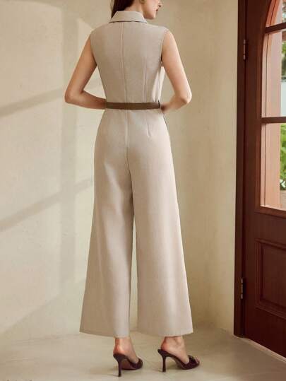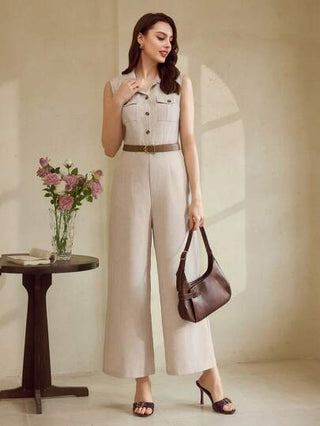 Vintamour جمبسوت سيدة أنيقة عتيقة ، مناسبة للربيع والصيف ، مزودة بجيوب عملية ، ياقة ذات رفرف ، جمبسوت مربوطة بحزام ، جمبسوت كاكي فاتح بدون أكمام
