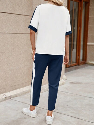 X JIMENA & MATEO EMERY ROSE طقم ملابس علوية قصيرة الأكمام ذات رقبة مستديرة وبنطال للنساء 2 قطعة